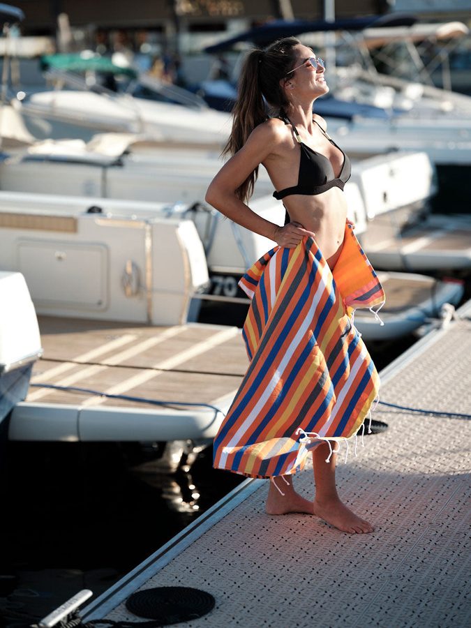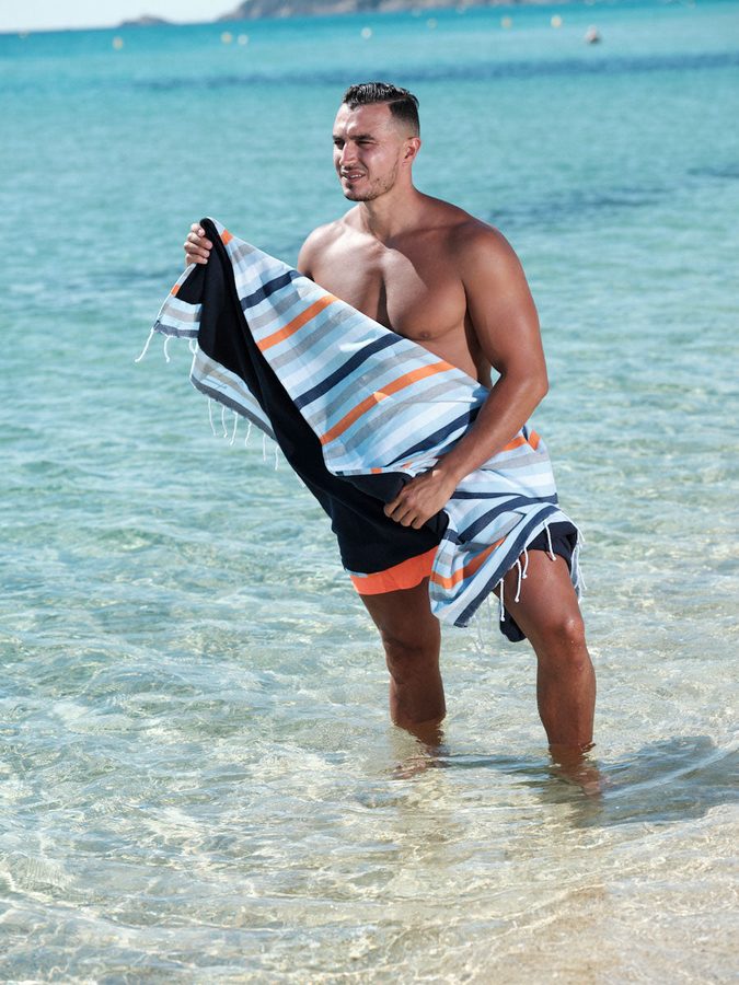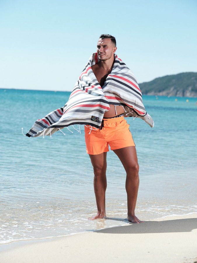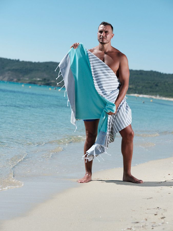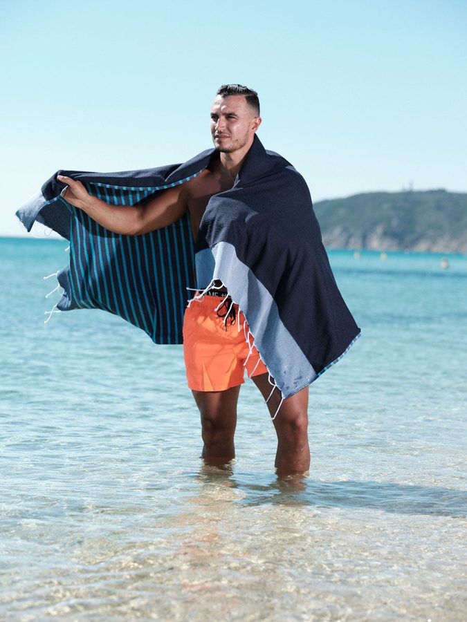 Les motifs — Sunset Beach et Marinière — on les a dessinés en pensant à la Côte d'Azur, aux vieilles cartes postales, aux parasols fanés.